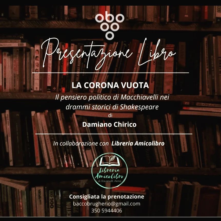 Lunedì 14 novembre, alle 20:00, vi aspetto da Bacco, in via Cavour 1, per la presentazione del mio libro “La corona vuota” in compagnia di Libreria Amicolibro: fra Machiavelli, Shakespeare e un buon bicchiere di vino…